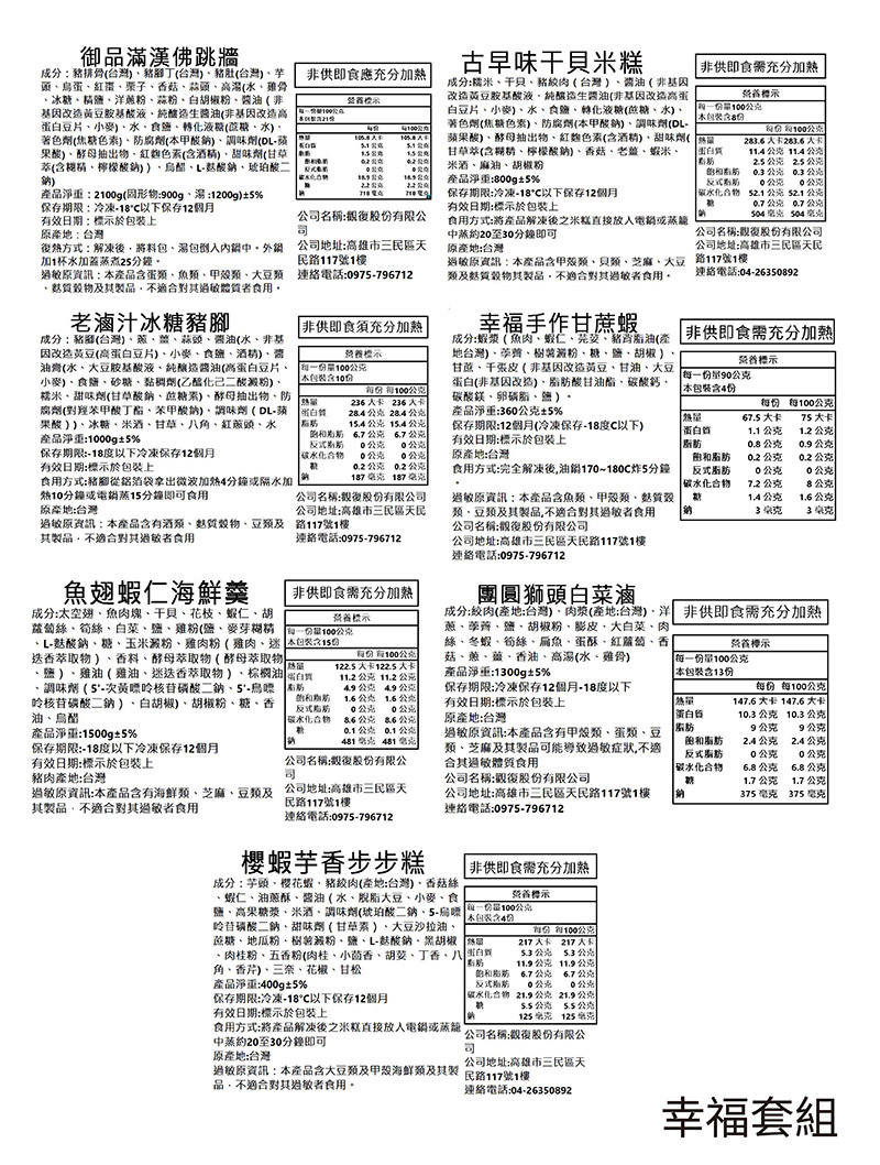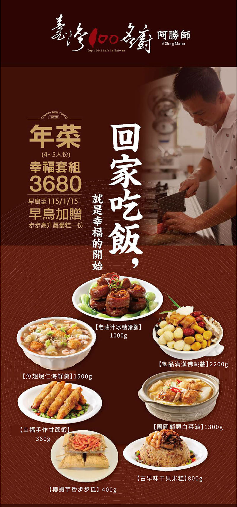 回家吃飯 是最簡單的幸福 年菜 2026幸福套組 4-5人份$3680 【老滷汁冰糖豬腳】1000g 【御品滿漢佛跳牆】2200g 【魚翅蝦仁海鮮羹】1500g 【幸福手作甘蔗蝦】360g 【櫻蝦芋香步步糕】400g 【團圓獅頭白菜滷】1300g 【古早味干貝米糕】800g